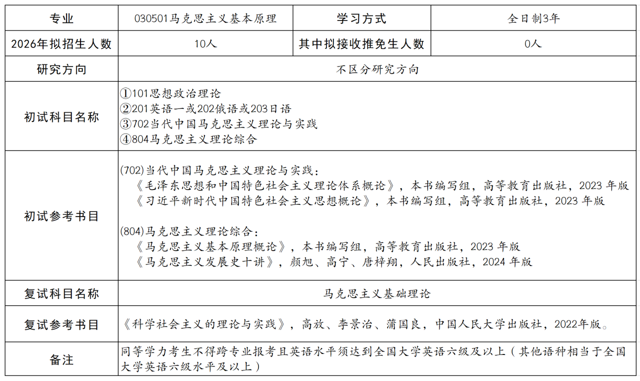 ①马克思主义基本原理专业(学硕,代码030501,授予法学硕士学位)