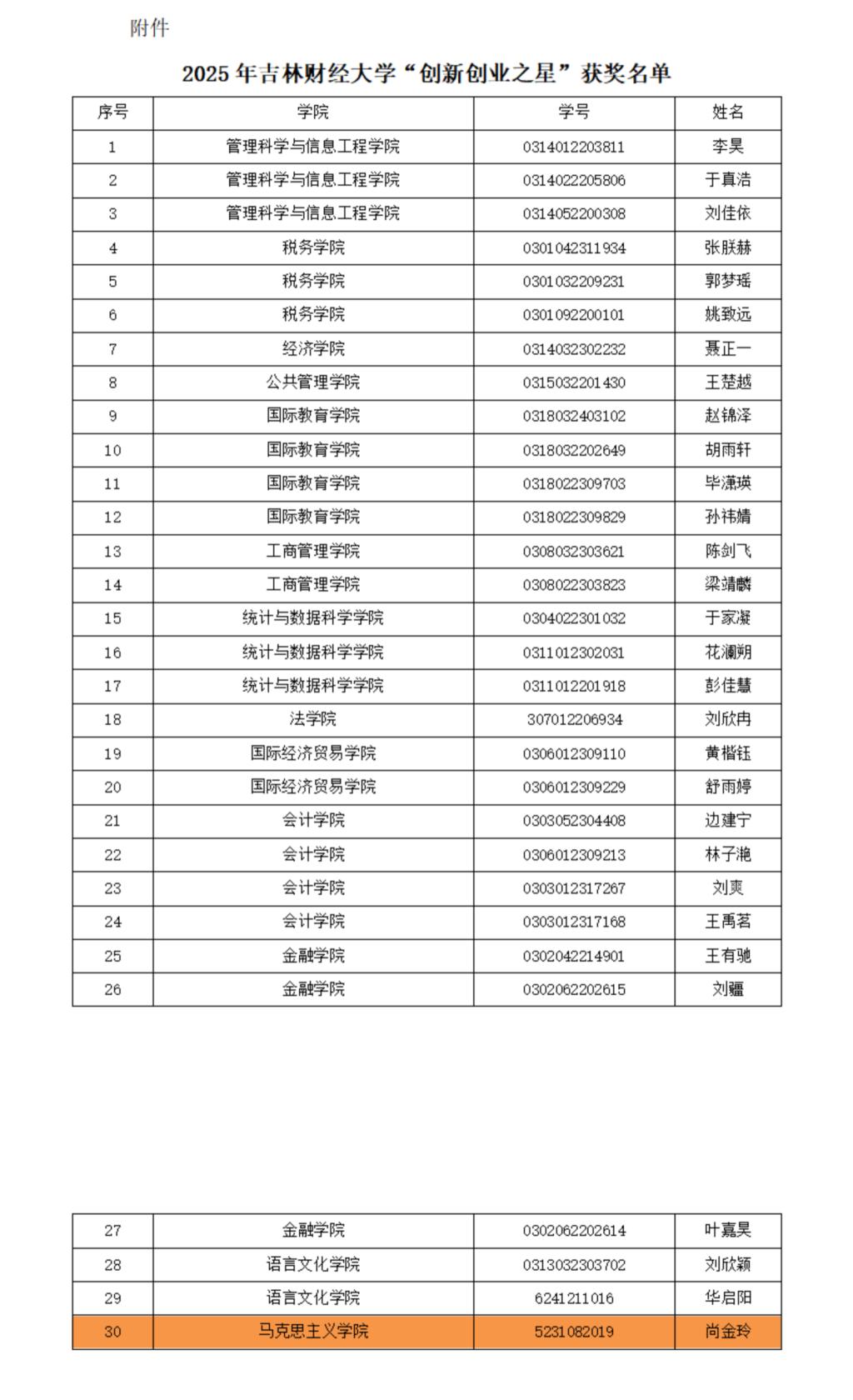近日,2025年吉林财经大学“创新创业之星” 评选结果揭晓,经学校推荐、结果公示,确定2025年吉林财经大学“创新创业之星”30人。我院2023级思想政治教育专业尚金玲同学获评2025年吉林财经大学“创新创业之星”。