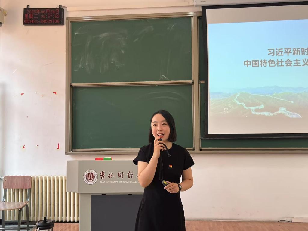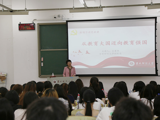 学校副校长王菁华以《从教育大国迈向教育强国》为主题,为金融学院学生上了一堂思政“金课”。王菁华以“你心目中的教育强国是什么样子”为开篇,通过师生互动沟通引入课堂教学主题。她立足于金融学子的学科专业背景与成长聚焦问题,结合我校的教学资源优势、教学建设现况与优秀校友代表等鲜活的身边人与身边事,使学生进一步明确了青年一代的责任与担当。她鼓励新时代的吉财学子在“明德崇实”校训的指引下共绘教育强国建设新图景,朝着2035年建成教育强国的奋斗目标阔步向前。