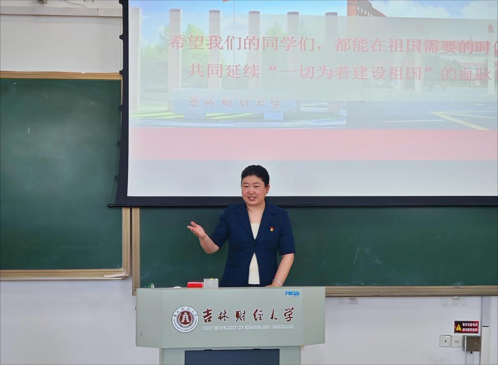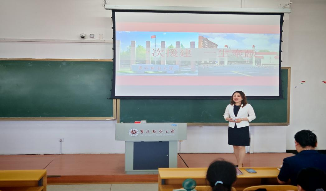 学校副校长杨楠以《一次援建 一生奉献》为主题,为税务学院的学生上了一堂别开生面的校史思政课。杨楠结合丰富的实践经验,饱含炽热的教育情怀,讲述了我校与上海财经大学合作共建的发展历程。她回顾了29位来自上海财经大学的教授在建校之初,响应国家号召,跋山涉水来到长春,克服工作和生活中的种种困难,深深扎根于祖国需要的地方。思政课的魅力,在于它能点亮思想的火花,塑造灵魂的高度,激发行动的自觉,杨楠以亲身示范诠释了奉献精神与两校合作的血脉渊源。她号召吉财学子,都能在祖国需要的时候,共同延续“一切为着建设祖国”的血脉。