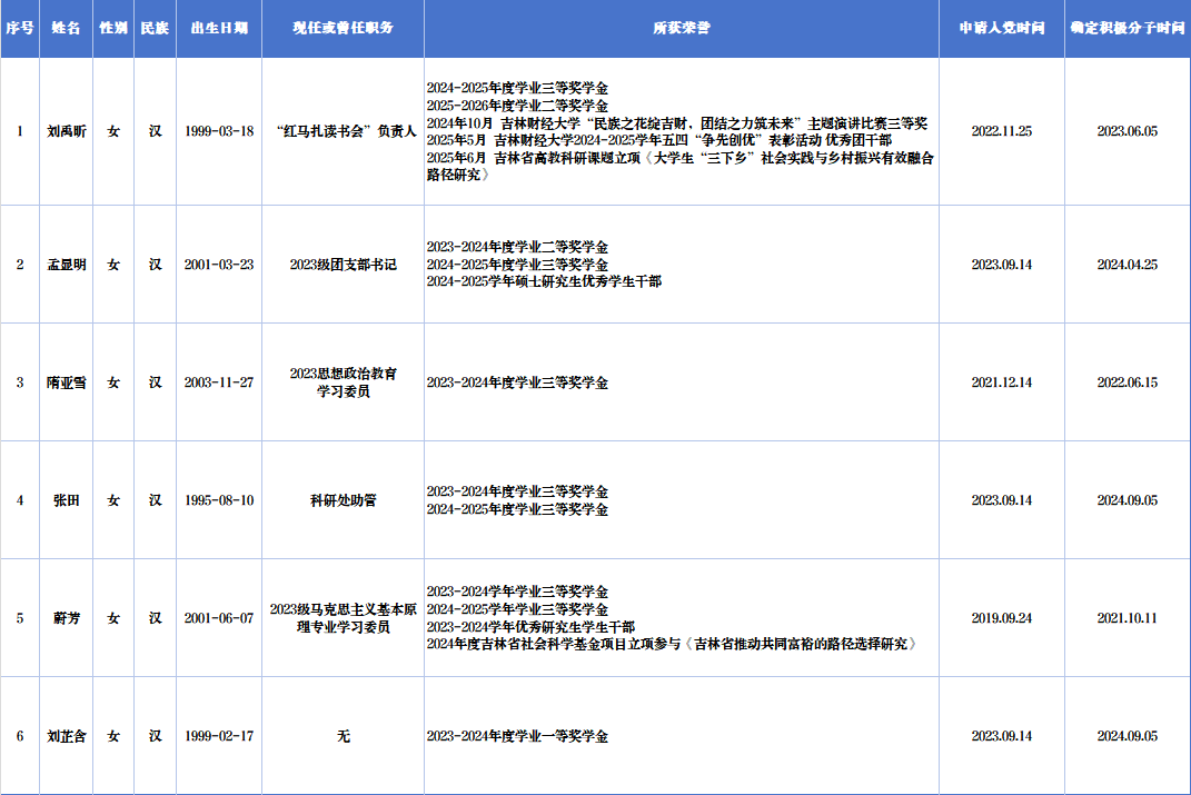 经学院研究生党支部推荐,所在班级民主测评,报学院党委研究同意,拟将刘禹昕、孟显明、隋亚雪、张田、蔚芳、刘芷含六名同志列为发展对象。根据发展党员工作有关要求,现将有关情况公示如下: