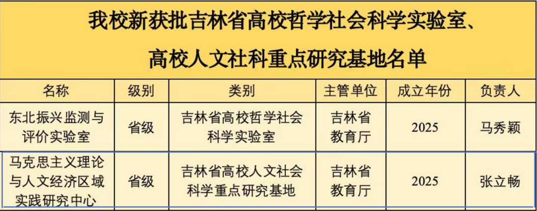 近日,吉林省教育厅先后公布了第二批吉林省高校哲学社会科学实验室名单(吉教科字〔2025〕3号)以及吉林省人文社会科学重点研究基地立项建设结果(吉教科字〔2025〕4号),由马克思主义学院院长张立畅牵头申报的“马克思主义理论与人文经济区域实践研究中心”,成功获批吉林省高校人文社科重点研究基地,建设期三年。