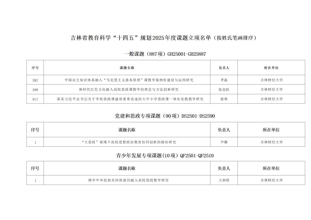 近日,在吉林省教育科学研究领导小组办公室公布的吉林省教育科学“十四五”规划2025年度课题立项名单中,我院共有5名老师的课题成功获批立项。其中李磊老师、张忠跃老师、梁策老师三位老师的课题获批一般课题立项,尹璐老师、王炳程老师两位老师的课题获批专项课题立项。